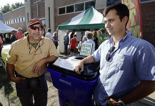We only require that you rinse out the bottles and jars you want to take for recycling so that they are free of food, oil, or waxy residue. Also, please remove the caps, lids, and any plastic inserts such as in olive oil bottles. You can leave the labels and aluminum or plastic neck rings on.